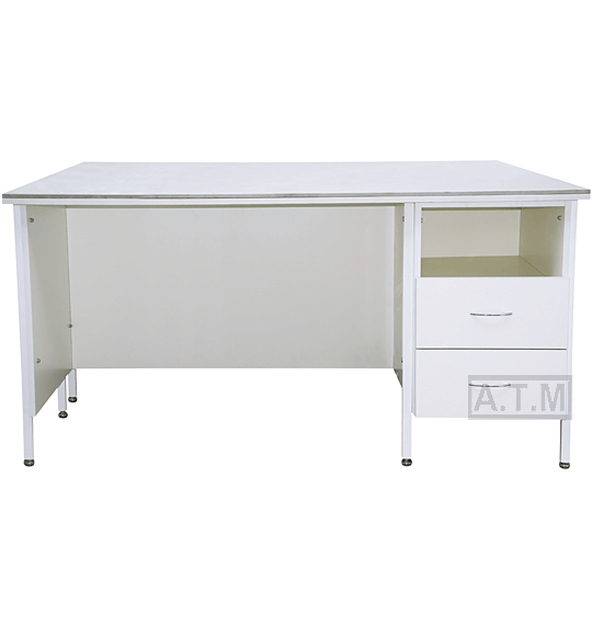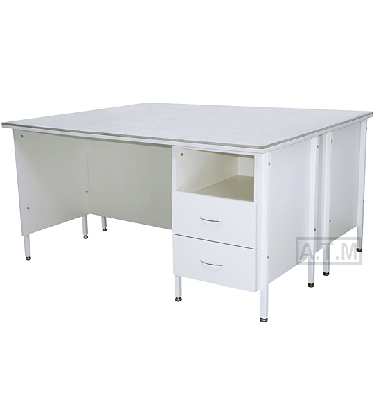 Стол оснащен тумбой с 2 ящиками на роликовых направляющих и нишей;
