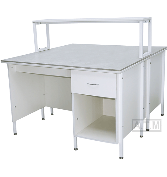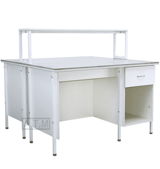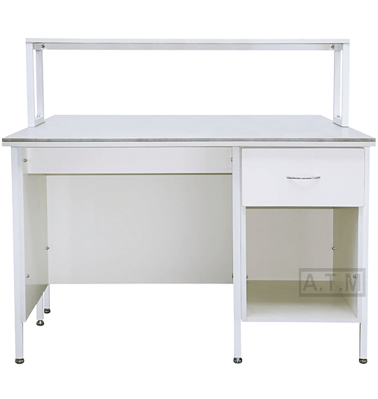 Стол оснащен тумбой с ящиком на роликовых направляющих и нишей;