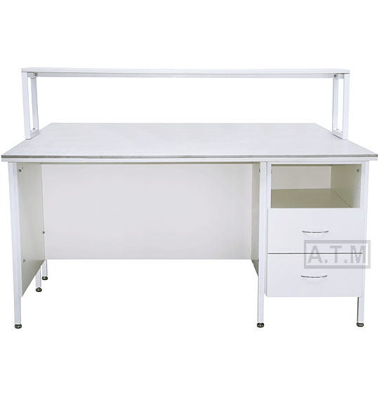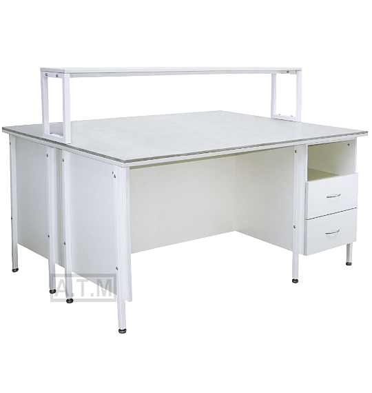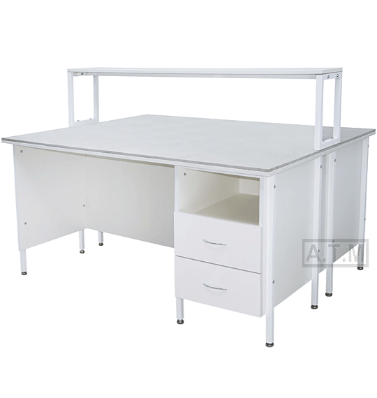 Стол оснащен тумбой с 2 ящиками на роликовых направляющих и нишей;