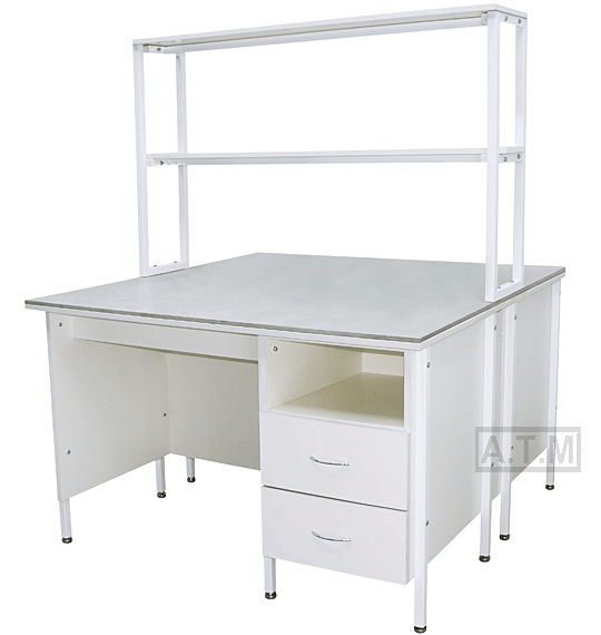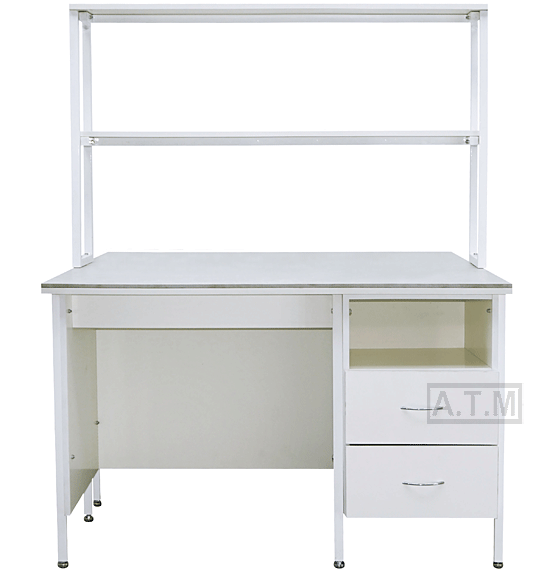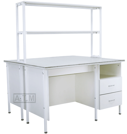 Стол оснащен тумбой с 2 ящиками на роликовых направляющих и нишей;