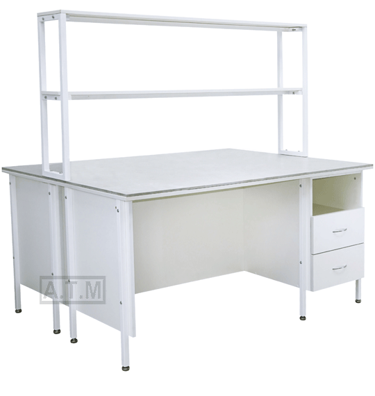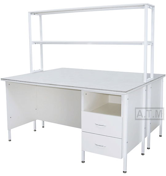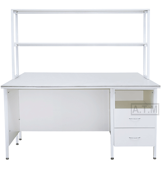 Стол оснащен тумбой с 2 ящиками на роликовых направляющих и нишей;