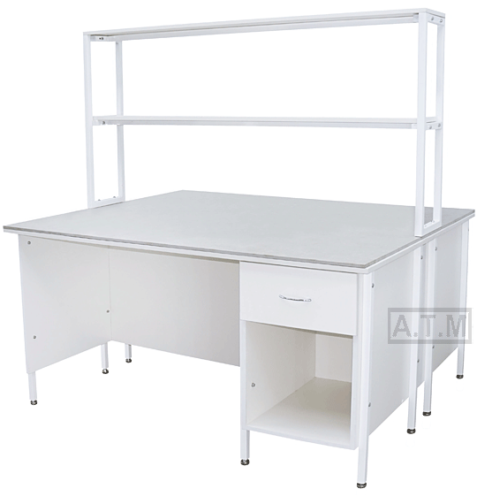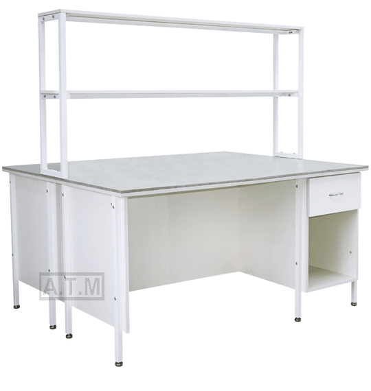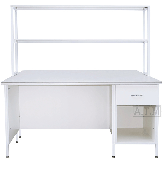 Стол оснащен тумбой с ящиком на роликовых направляющих и нишей;