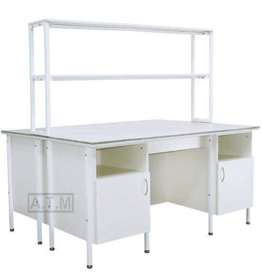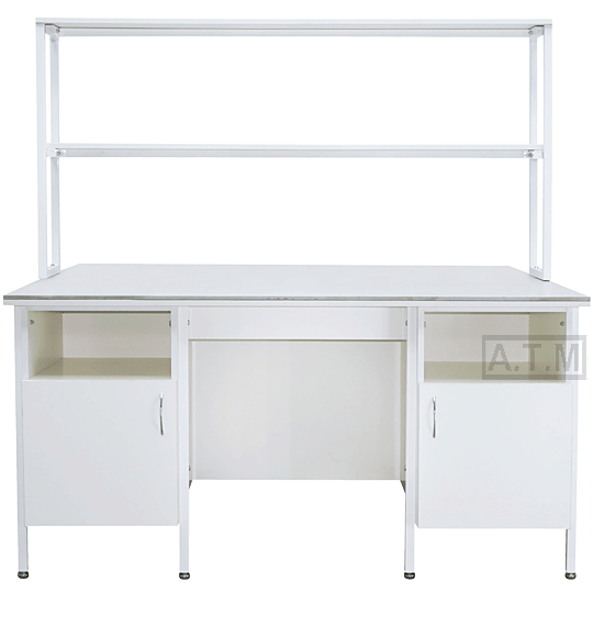Стол снабжен надстройкой с двумя полками;