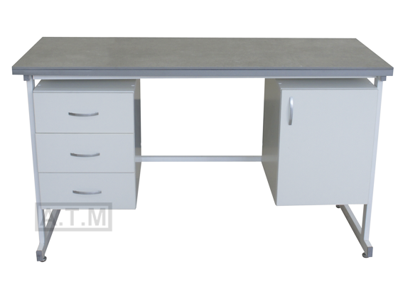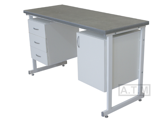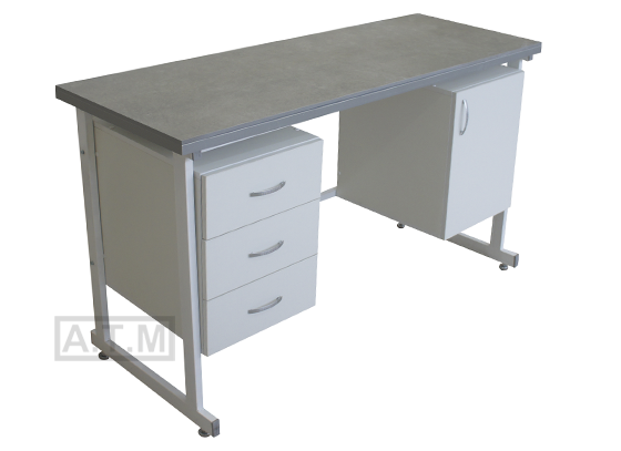 Стол оснащен тумбой с распашной створкой и тумбой с тремя ящиками на роликовых направляющих;