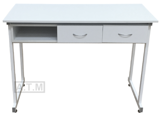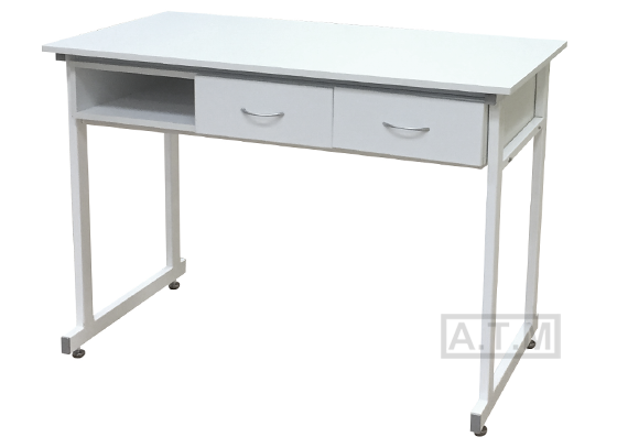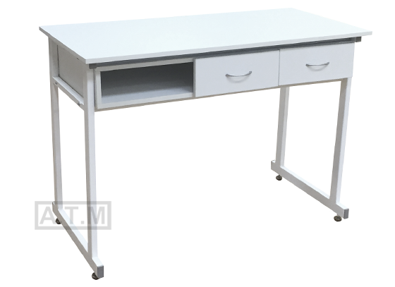 Стол оснащен тумбой с 2 ящиками на роликовых направляющих и нишей;
