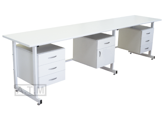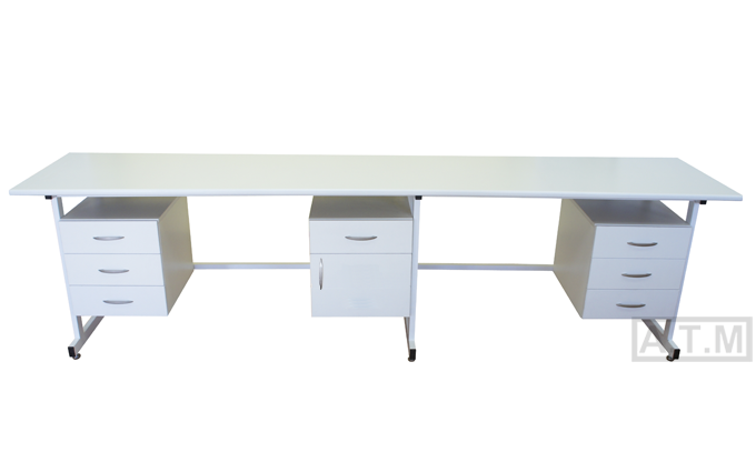 Две тумбы по бокам оснащены 3 ящиками на роликовых направляющих.Средняя тумба имеет ящик и створку;