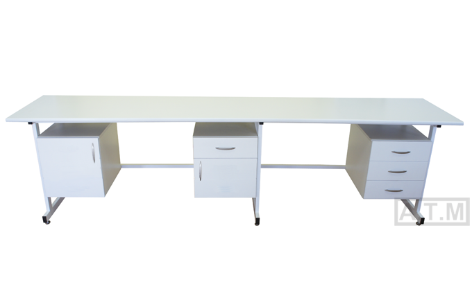 Левая тумба оснащена створкой. Средняя тумба - ящиком и створкой, правая - 3 ящиками на роликовых направляющих;