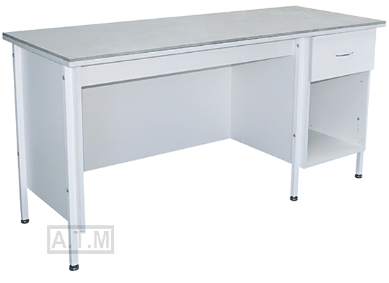 Стол оснащен тумбой с ящиком на роликовых направляющих и нишей;