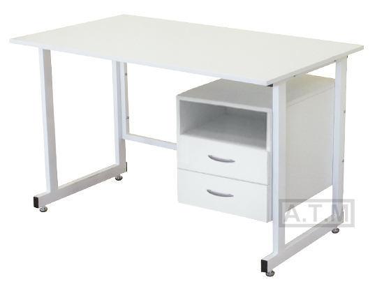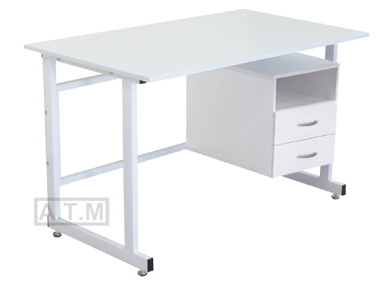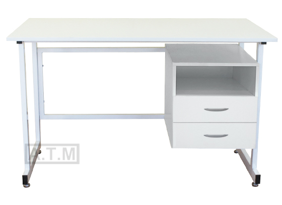 Стол оснащен тумбой с двумя ящиками на роликовых направляющих и нишей;