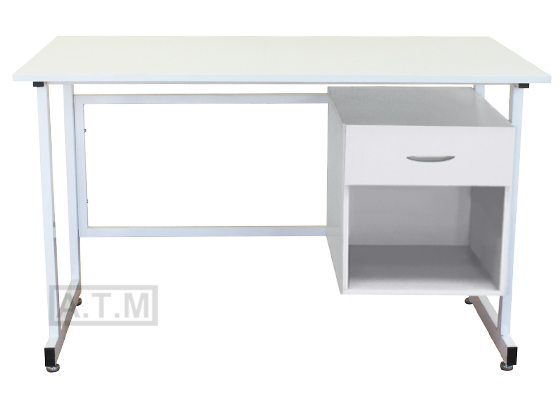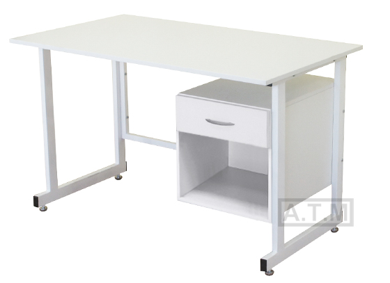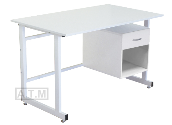 Стол оснащен тумбой с ящиком на роликовых направляющих и нишей;