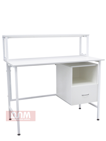 Стол снабжен надстройкой с одной полкой и подвесной тумбой с нишей и ящиком.
