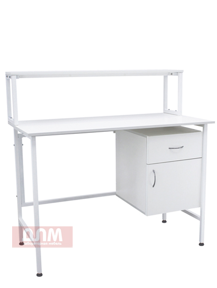 Стол снабжен надстройкой с одной полкой и подвесной тумбой с ящиком и створкой.