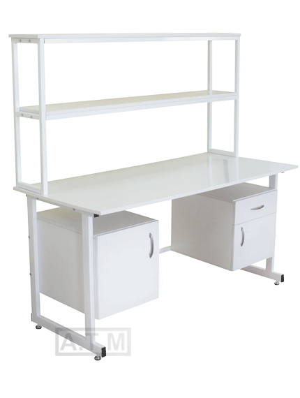 Стол снабжен надстройкой с двумя полками;