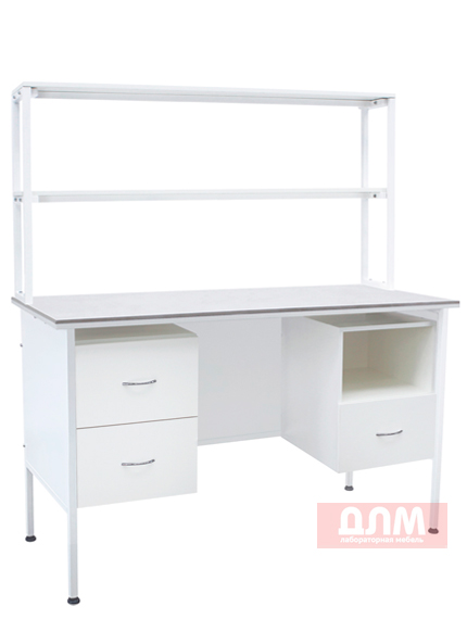 Стол снабжен надстройкой с двумя полками и 2-я подвесными тумбами.