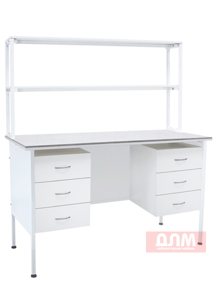 Стол снабжен надстройкой с двумя полками и 2-я подвесными тумбами с 3-я ящиками.