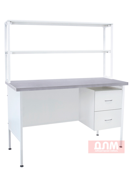 Стол снабжен надстройкой с двумя полками и подвесной тумбой с 2-я ящиками на роликовых направляющих.
