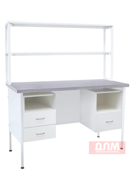 Стол снабжен надстройкой с двумя полками и 2-я подвесными тумбами.
