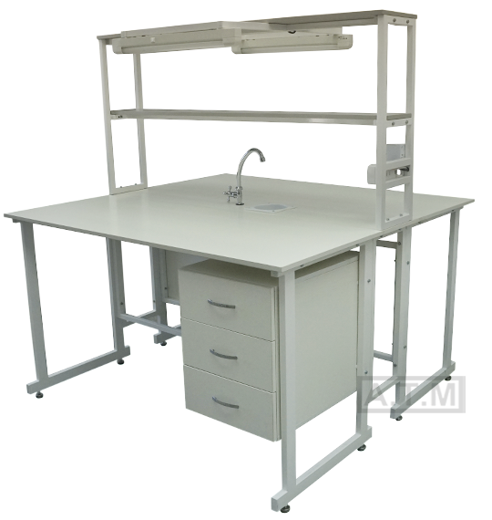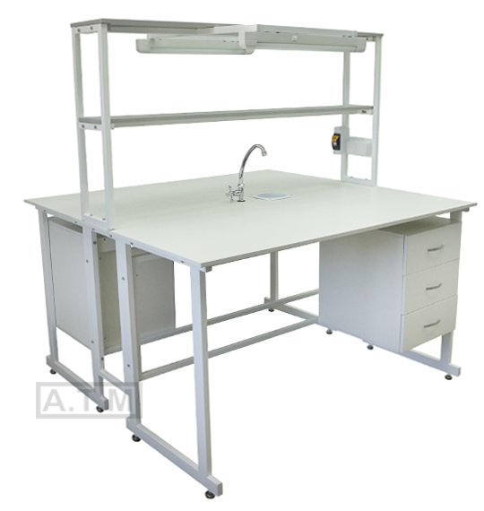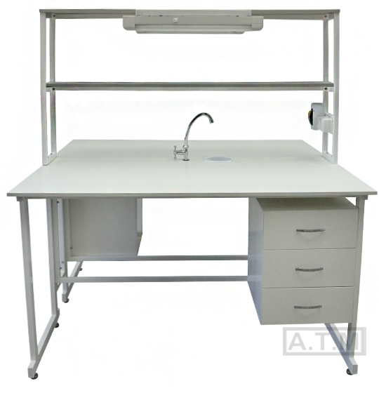 Стол снабжен надстройкой с двумя полками, двумя розетками, автоматом отключения питания на 16А, двумя светодиодными светильниками, мойкой и краном;