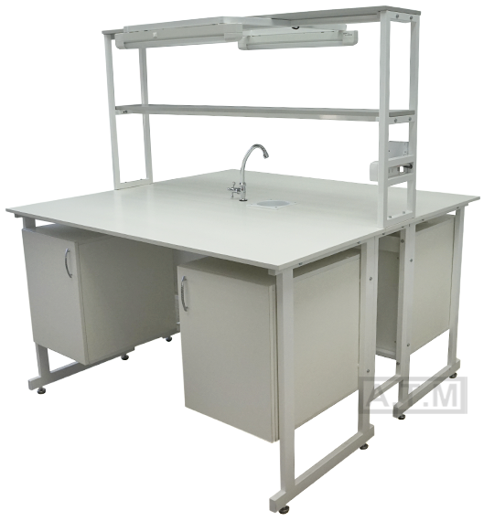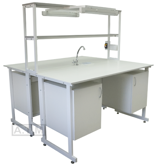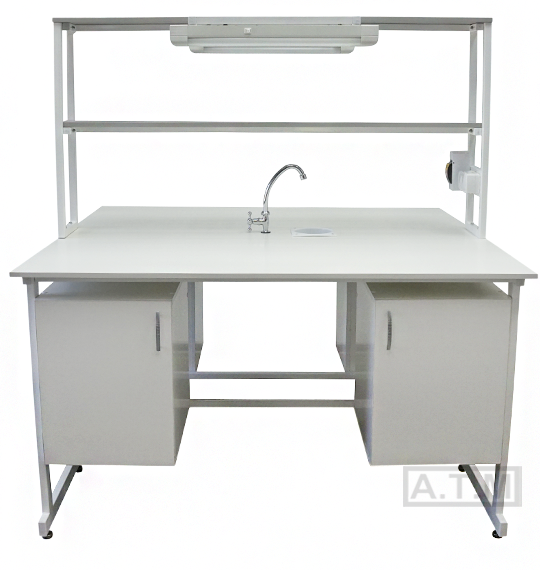 Стол снабжен надстройкой с двумя полками, двумя розетками, автоматом отключения питания на 16А, двумя светодиодными светильниками,мойкой и краном;