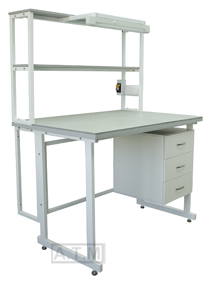 Стол снабжен надстройкой с 2 полками, 2 розетками, автоматом отключения питания на 16А и светодиодным светильником;