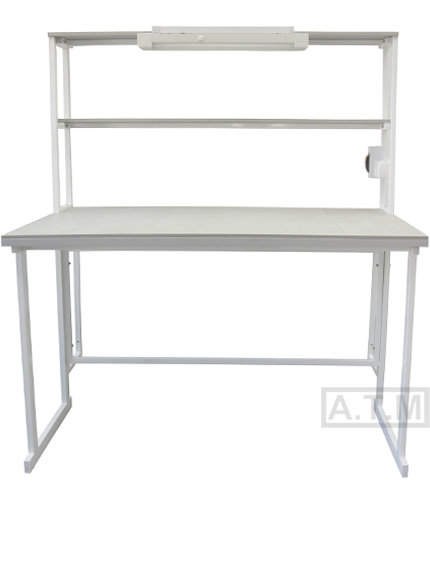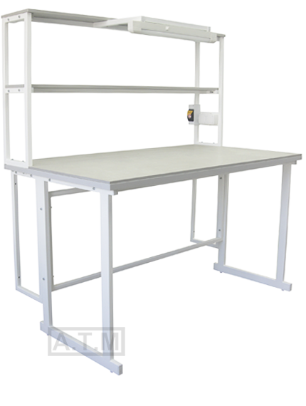 Стол снабжен надстройкой с 2 полками, 2 розетками, автоматом отключения питания на 16А и светодиодным светильником;