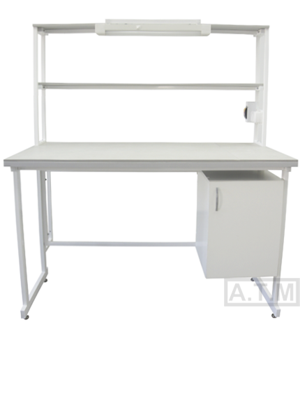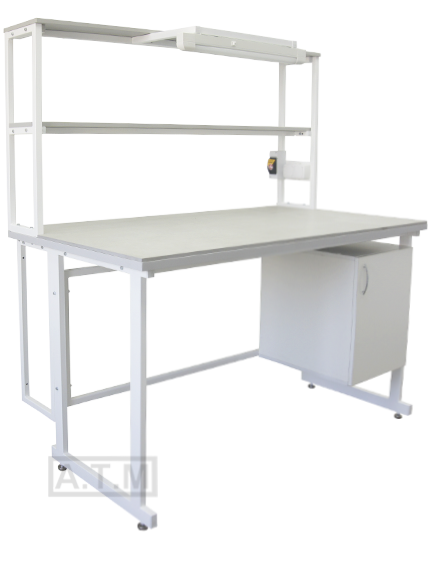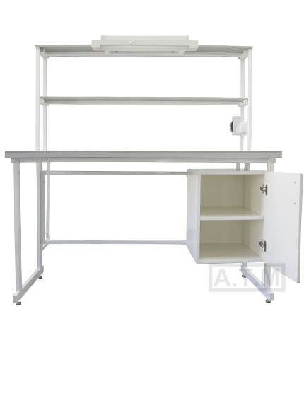 Стол снабжен надстройкой с 2 полками, 2 розетками, автоматом отключения питания на 16А и светодиодным светильником;
