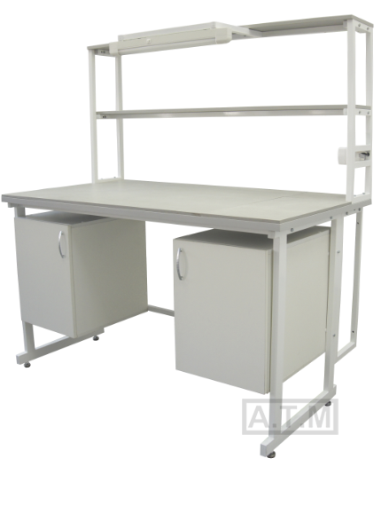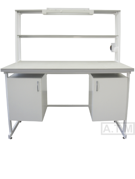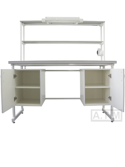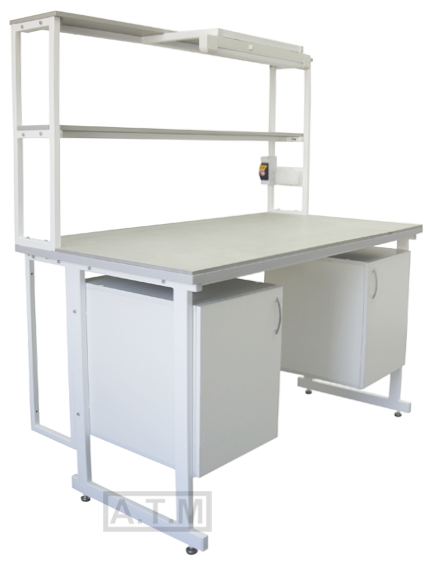 Стол снабжен надстройкой с 2 полками, 2 розетками, автоматом отключения питания на 16А и светодиодным светильником;