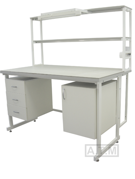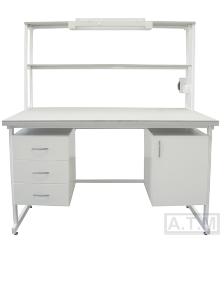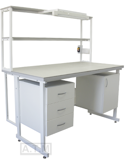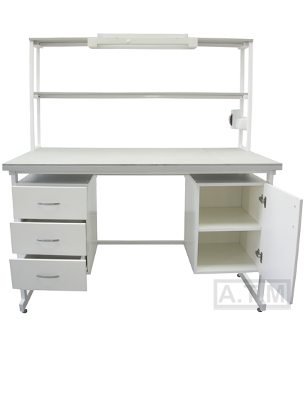 Стол снабжен надстройкой с 2 полками, 2 розетками, автоматом отключения питания на 16А и светодиодным светильником;