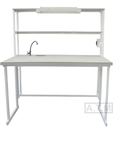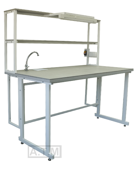 Стол снабжен надстройкой с 2 полками, 2 розетками, автоматом отключения питания на 16А,светодиодным светильником, мойкой и краном;