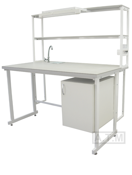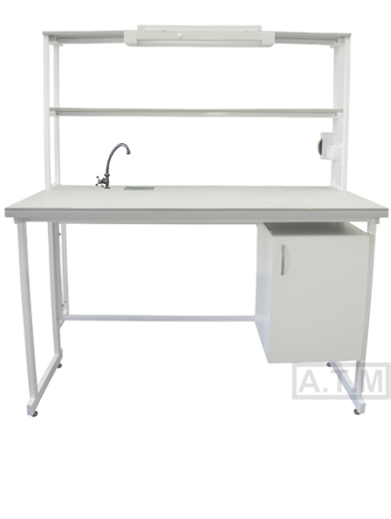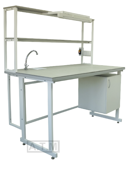 Стол снабжен надстройкой с 2 полками, 2 розетками, автоматом отключения питания на 16А,светодиодным светильником, мойкой и краном;