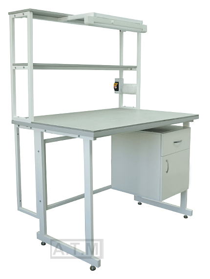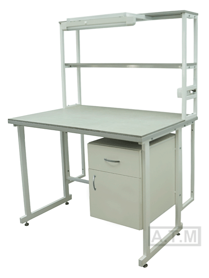 Стол снабжен надстройкой с 2 полками, 2 розетками, автоматом отключения питания на 16А и светодиодным светильником;