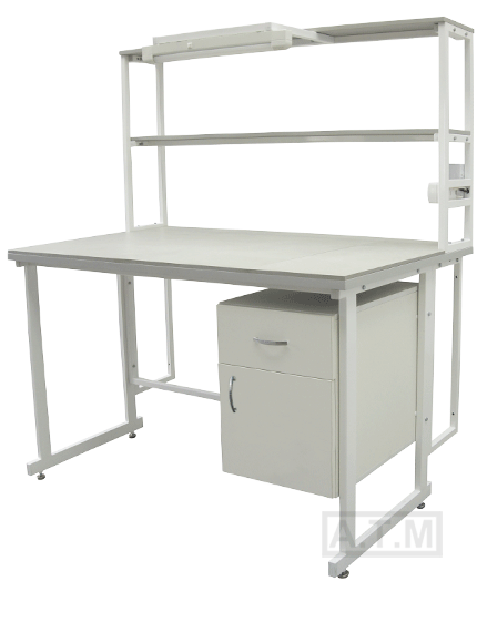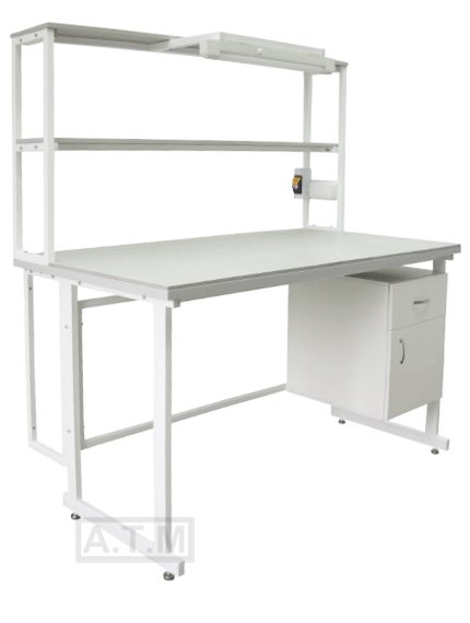 Стол снабжен надстройкой с 2 полками, 2 розетками, автоматом отключения питания на 16А и светодиодным светильником;