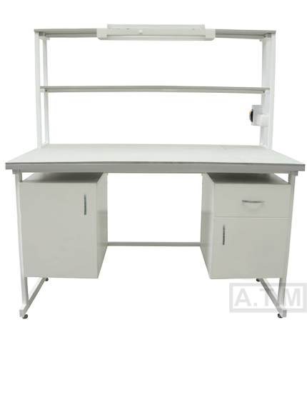 Стол снабжен надстройкой с 2 полками, 2 розетками, автоматом отключения питания на 16А и светодиодным светильником;