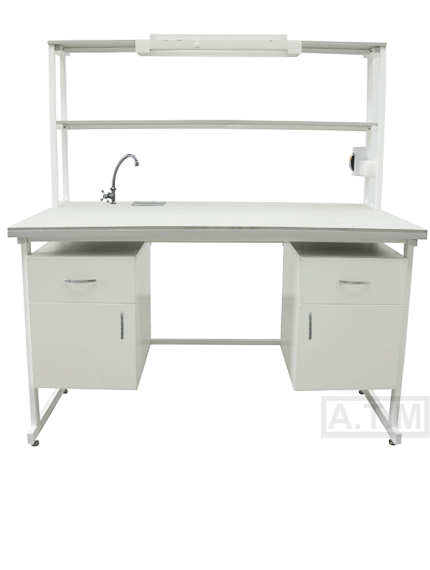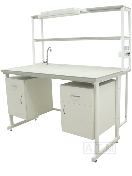 Стол снабжен надстройкой с 2 полками, 2 розетками, автоматом отключения питания на 16А,светодиодным светильником, мойкой и краном;