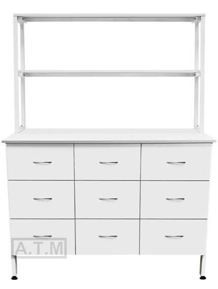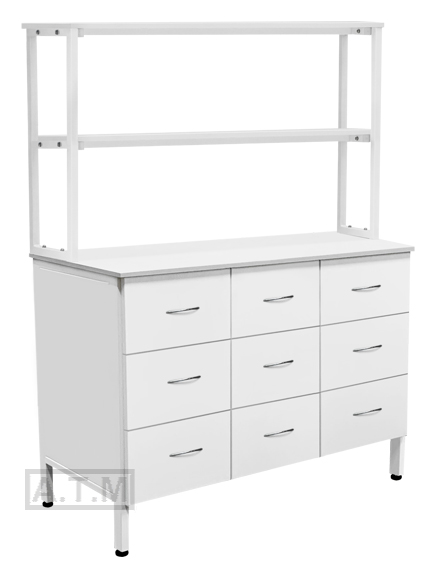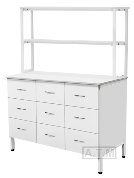 Стол оснащен 9 ящиками на шариковых направляющих и надстройкой с двумя полками