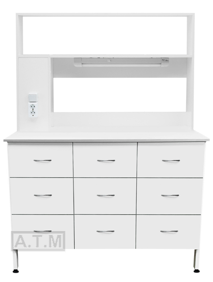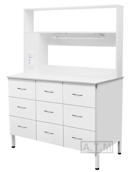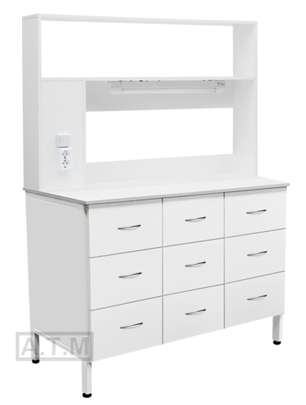 Стол оснащен 9 ящиками на шариковых направляющих и надстройкой