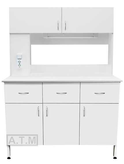 Стол оснащен 3-я ящиками на шариковых направляющих в верхней части, тремя створками в нижней части  и надстройкой