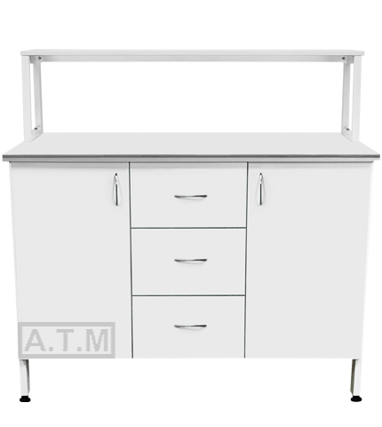 Стол оснащен по бокам створками, в центре 3 ящиками на шариковых направляющих и надстройкой с одной полкой