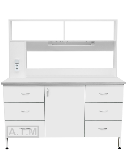 Стол оснащен по боками 3-я ящиками на шариковых направляющих, в центре одной створкой и надстройкой