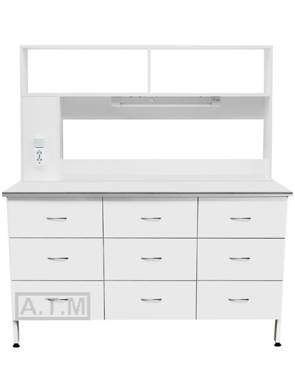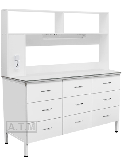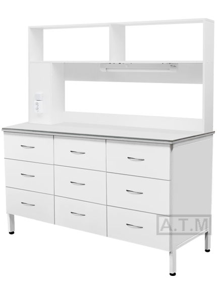 Стол оснащен 9 ящиками на шариковых направляющих и надстройкой