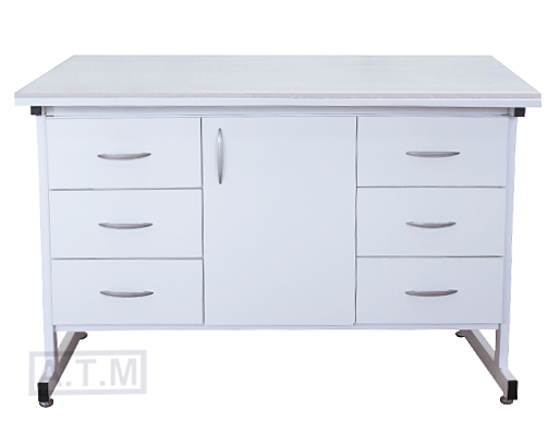Стол оснащен по боками 3 ящиками на роликовых направляющих а в центре одной створкой;