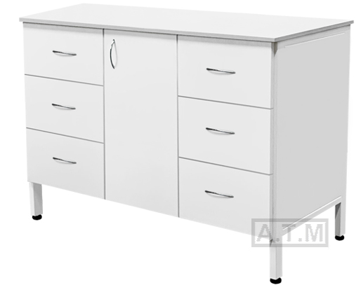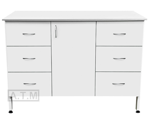 Стол оснащен по боками 3-я ящиками на шариковых направляющих, а в центре одной створкой