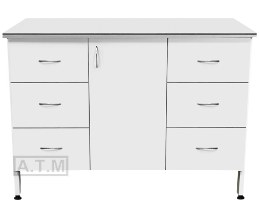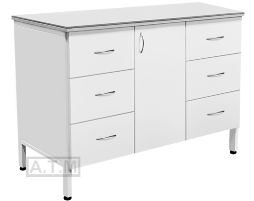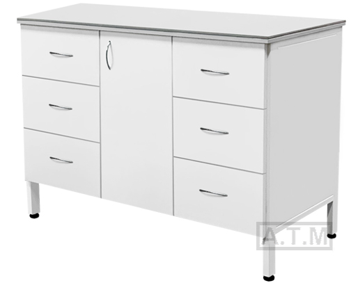 Стол оснащен по боками 3-я ящиками на шариковых направляющих, а в центре одной створкой