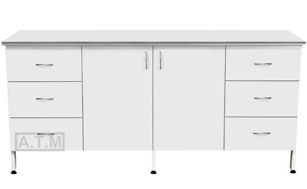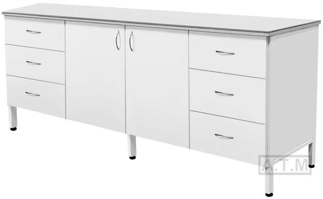 Стол оснащен по боками 3-я ящиками на шариковых направляющих, а в центре двумя створками