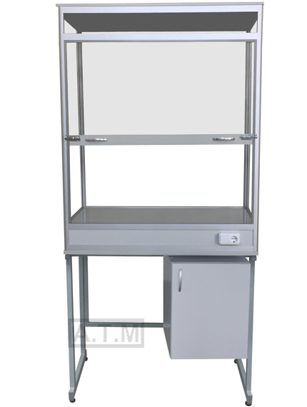 Шкаф оснащён: светодиодным светильником, вентилятором, полипропиленовой мойкой (диаметр 150 мм), краном (холодная вода), автоматом отключения питания, розеткой и выключателем;